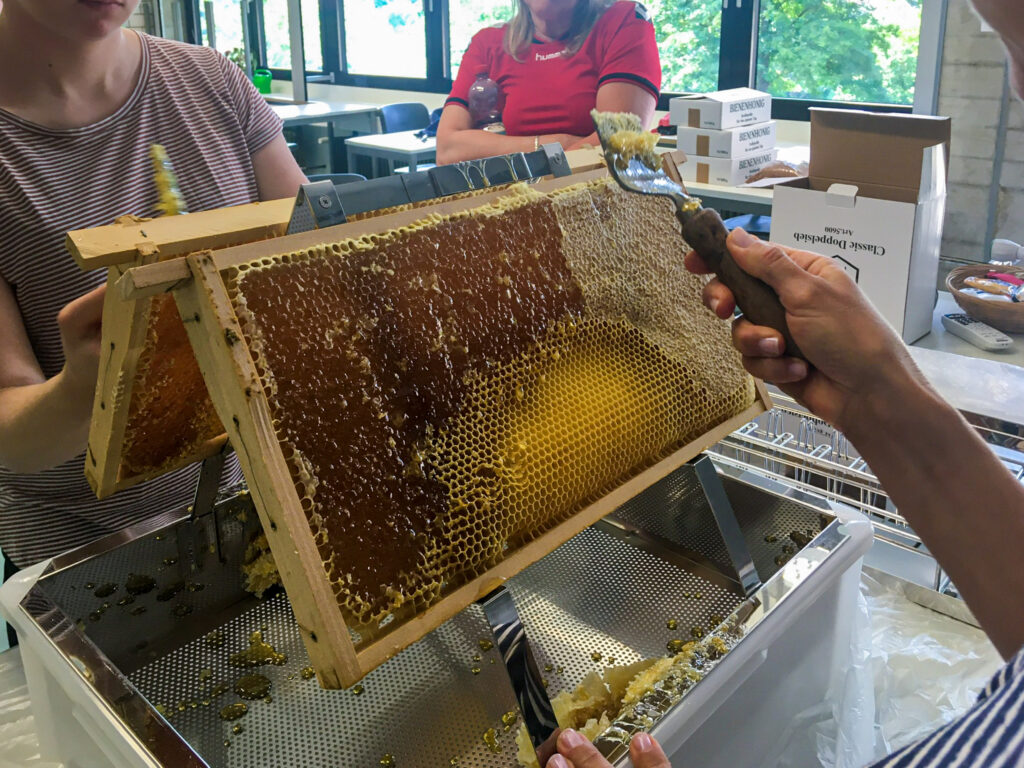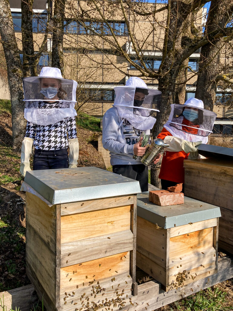 Seit 2019 ist die Bienen AG am Murrhardter Gymnasium aktiv und hat die Zahl der Völker mittlerweile über einen Ableger von zwei auf drei erhöhen können, denn die Bienen fühlen sich auf der Streuobstwiese neben der Schule sehr wohl. Betreut wird die Bienen AG von einer Lehrein, die jedes Jahr rund drei neue Lernende für die Arbeitsgemeinschaft gewinnen kann. Und viel Arbeit bedeutet die Pflege der Bienenvölker allemal: Durch Beobachtung und Eingriffe müssen die jungen Imker:innen kontrollieren, ob genug Futter vorhanden ist, ob sich die Königin in der Eilage befindet, ob das Volk genug Platz hat oder sich in Schwarmstimmung befindet und ob es durch Varroamilben oder andere Krankheiten befallen ist. Zu Ende der Saison, die von Mai bis August reicht, wird dann der Honig gewonnen, wofür die Waben mit viel Kraft geschleudert werden müssen und das Wachs eingeschmolzen werden muss. Rund 30 Kilogramm Honig konnten so im letzten Jahr gewonnen werden! Damit ist die Arbeit jedoch noch nicht zu Ende, denn im Herbst werden außerdem die Äpfel von der Streuobstwiese geerntet und zu eigenem Apfelsaft gepresst, sodass die Schüler:innen ein umfassendes, praktisches Wissen über den natürlichen Kreislauf von Bestäubung bis Ernte erhalten.